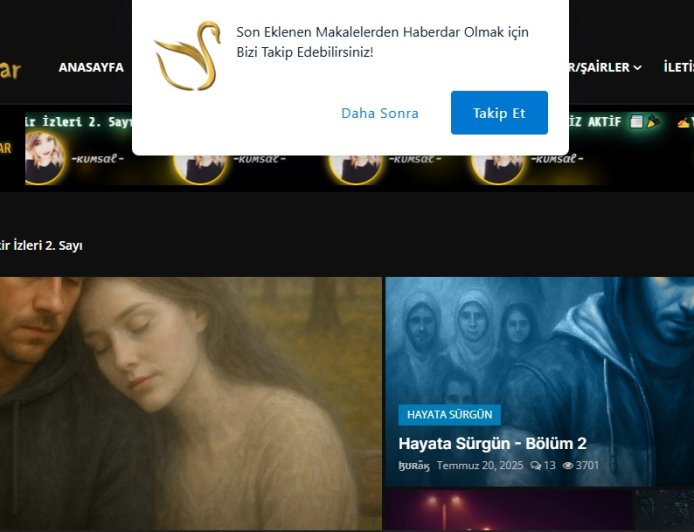 Ve artık sevindirici bir haber: Yeni geliştirmelerimiz sayesinde bilgisayar, tablet ve telefonlarınızdan sitemize bir yazı eklendiğinde anında bildirim alabileceksiniz! Böylece hiçbir paylaşımı kaçırmadan, edebiyat dünyasındaki yeniliklerden anında haberdar olabileceksiniz.